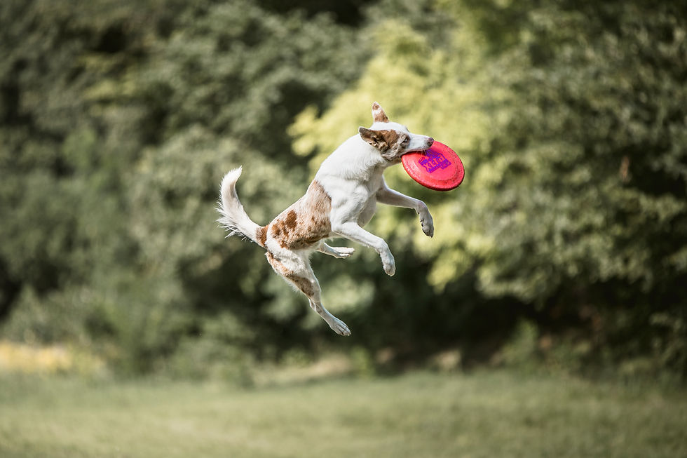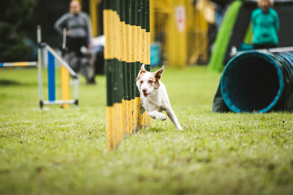 Na torze dostosowuje sie do mojego tempa, nie leci na oślep przed siebie, dużo myśli. Dopiero z czasem i ilością treningów nabrała większej pewności siebie i prędkości. Ma poprawną technikę skoku na agility, na frisbee zachowuje sie bardziej asekuracyjnie jeśli chodzi o wyskoki. Rodzeństwo Moxie sprawdza się w agility, frisbee i flyballu.
